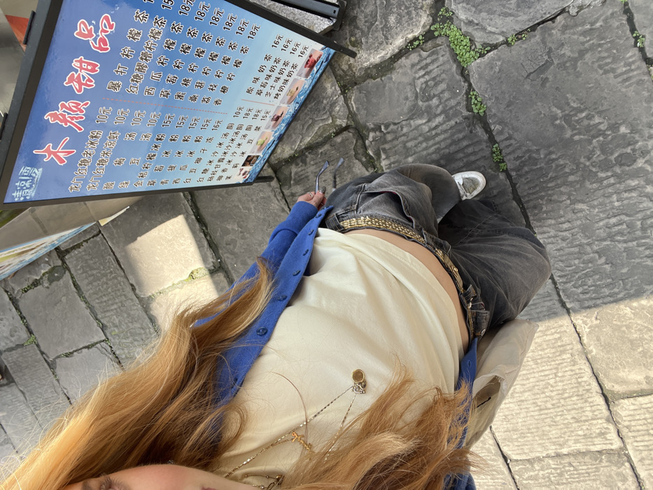 A high-angle, first-person perspective photograph captures an individual standing on a paved surface in Nan'an District, China. The person, partially visible from the lower face down, has long, light reddish-brown hair and is dressed in a light-colored short-sleeved top, a blue button-up cardigan, dark grey jeans secured with a gold-colored chain belt, and white sneakers. A multi-layered necklace with a small coin-like pendant and a script pendant is visible, along with rings on the fingers of the right hand, which holds a pair of eyeglasses. A light-colored bag is slung over the left shoulder. Adjacent to the person, a black-framed A-frame menu sign with a blue background displays a variety of beverages and their prices in Chinese Yuan (e.g., 10, 15, 16, 18 Yuan). Prominent text includes "木颜精晶" and "暴打柠檬茶," alongside listings for various ice jellies, fruit-flavored lemon teas (e.g., lychee, grape, passion fruit, lime), and milk teas (e.g., lychee, strawberry, cheese, taro mud). The ground is composed of large, irregularly shaped grey flagstones, with small patches of green vegetation growing within the seams. Strong, direct sunlight casts distinct shadows across the scene.