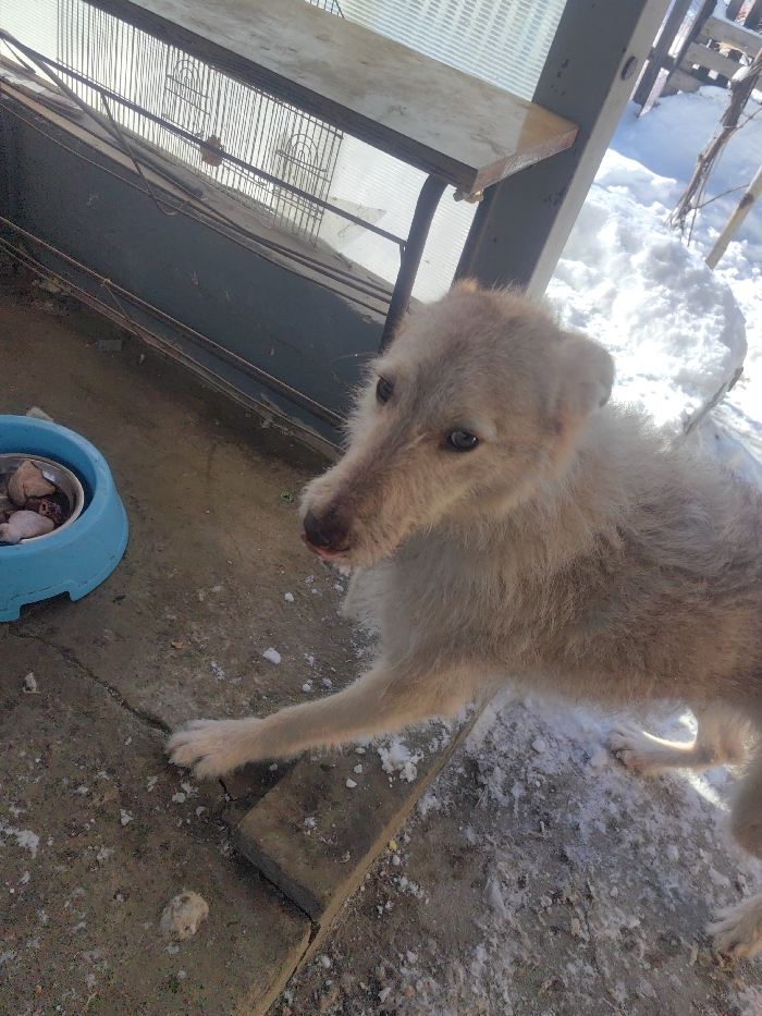 - "The image, taken in Volgograd, Russia, depicts a light-colored, shaggy-haired dog standing on a concrete surface partially covered in snow and dirt" by FM-R3bBn2, licensed under CC BY 4.0