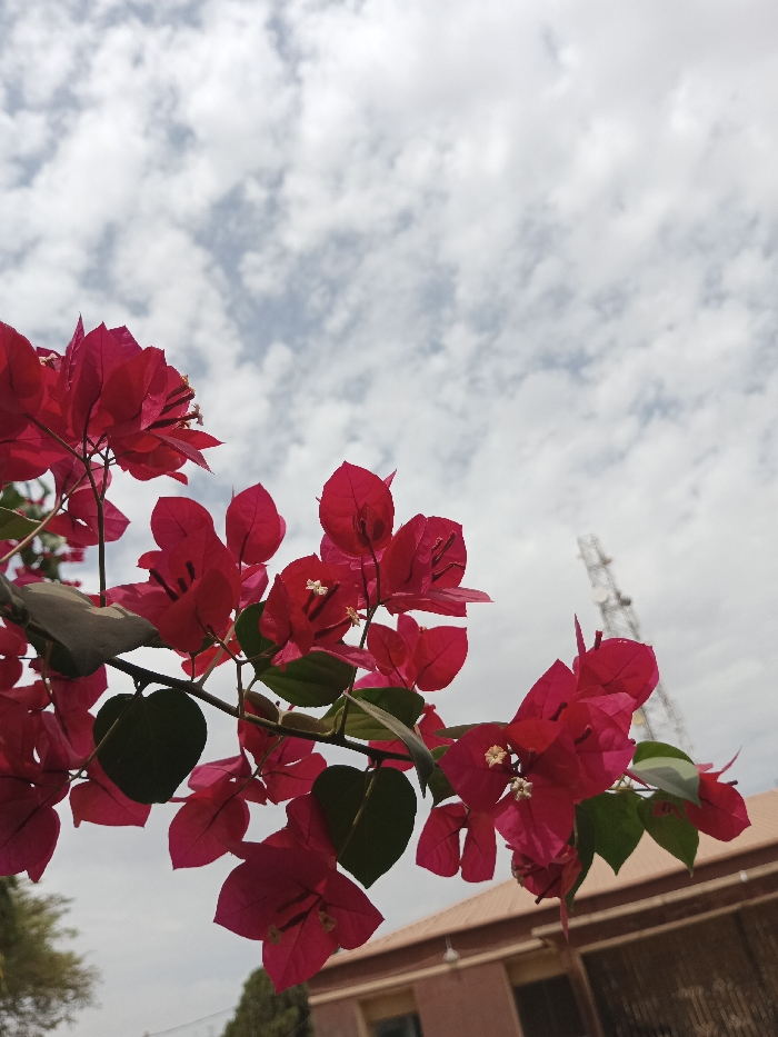 The image displays a close-up of a vibrant Bougainvillea branch, laden with numerous magenta-red bracts and small white-to-pale-yellow true flowers, dominating the lower and central portions of the frame. Green, heart-shaped leaves are visible interspersed among the floral clusters. The scene is set outdoors against a sky characterized by scattered white cumulus clouds, with patches of lighter blue visible between them. In the midground to the far background, several structures are discernible. On the upper right, a grey, lattice-style telecommunications tower is partially visible. Below it and extending towards the center-right, a building with a reddish-brown hip roof and light-colored walls is present, featuring dark, rectangular openings. Additional green tree foliage is visible in the extreme lower-left background. No individuals are present. This scene is located in the city of Jos, Nigeria.