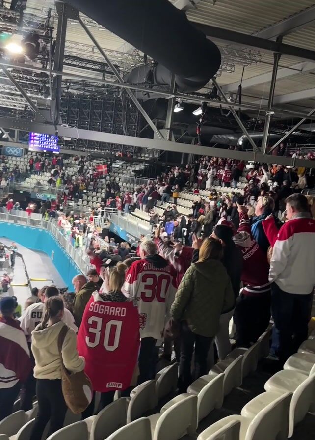 crowd of people, presumably spectators at an ice hockey game, in the stands. The majority of them are wearing jerseys, many of which are red and white. Several people are holding up their phones, possibly recording the event or taking pictures. The stands appear to be mostly full, with many other spectators visible further away. The arena has a high ceiling with industrial lighting and ventilation systems. The ice rink is partially visible at the bottom left of the frame. Some people are standing on the steps between the rows of seats, while others are seated. The overall atmosphere suggests an exciting moment, possibly a goal or the end of a game.