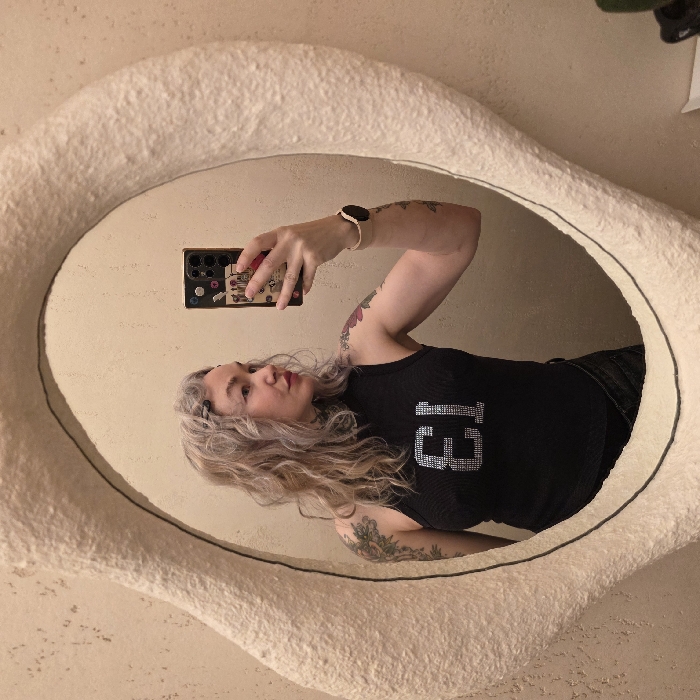 The image displays a female subject taking a mirror selfie in an indoor setting. The specific location in Pushkin, Russia, cannot be determined from the visual evidence. The subject has light-colored, wavy hair, and visible tattoos on her left shoulder and upper arm, and extending onto her neck. She wears a black ribbed sleeveless top featuring the number "13" in reflective silver-colored material on the chest. Her head is turned slightly to her right, presenting her left profile, with her gaze directed towards the smartphone she holds. She holds a dark-colored smartphone, equipped with a patterned or decorated case, in her right hand, positioning it to capture her reflection. A light-colored smartwatch with a circular face is present on her left wrist. The mirror features a distinctive, irregularly shaped, thick, and highly textured off-white frame. The background behind the mirror consists of a light-colored, textured wall, possibly stucco or plaster.