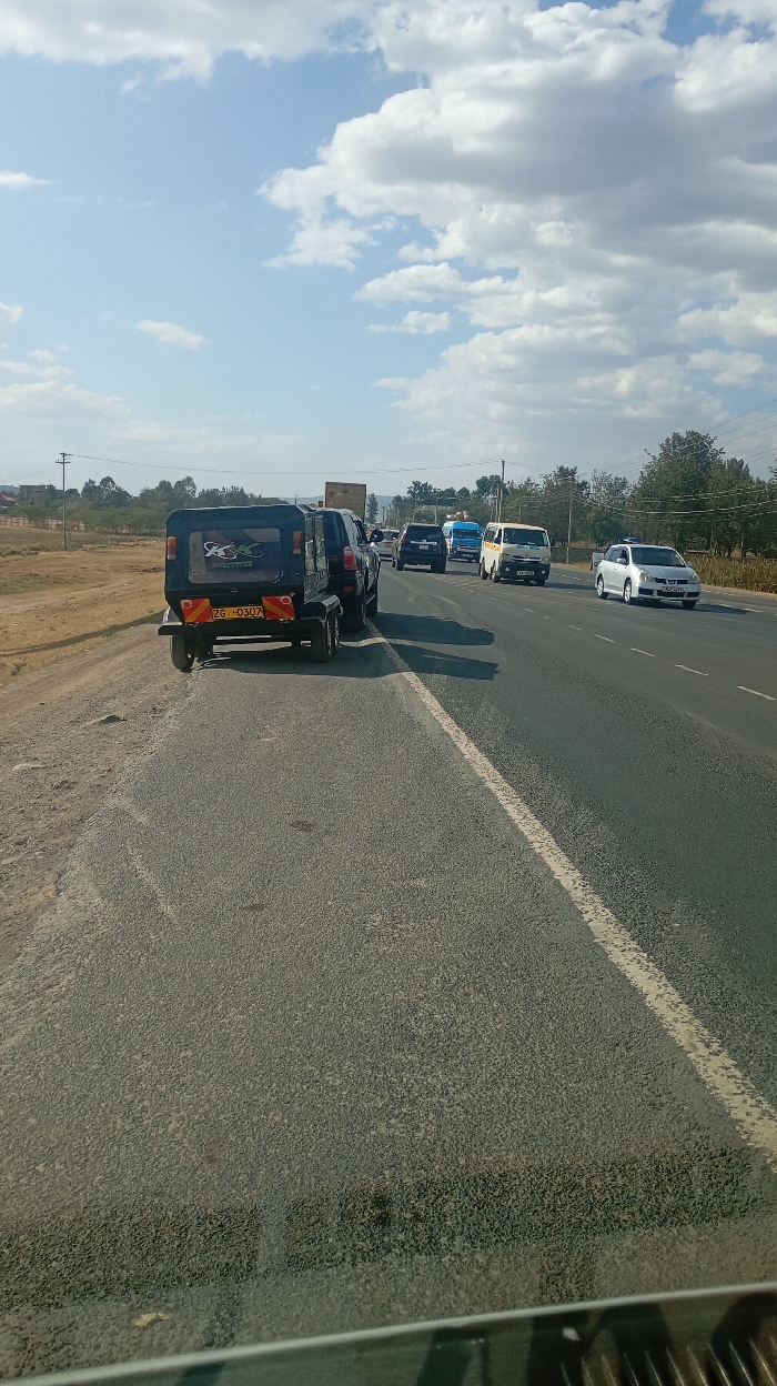 A sunny day scene features a highway with multiple vehicles, including a black tuk-tuk-like trailer with license plate Z6 0307 parked on the left side. Cars and vans fill the lanes going the same direction. Blue skies with scattered clouds dominate the background. A dry grassy area and some trees border the highway. The image is taken from inside a vehicle, looking out across the road.