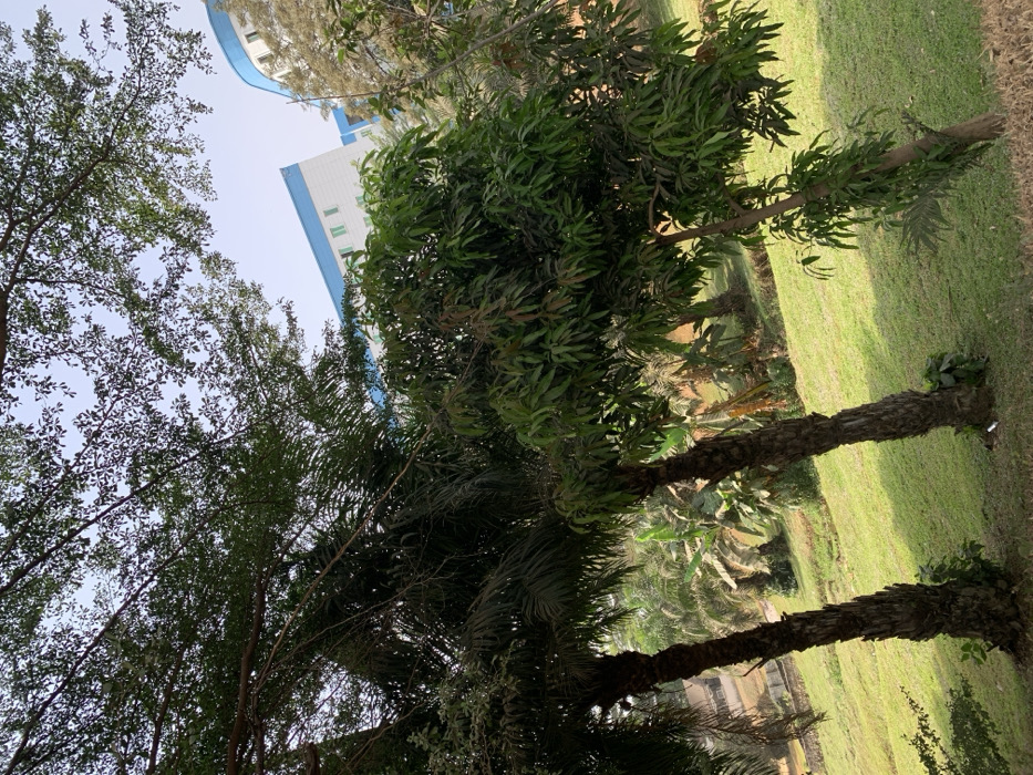 The image displays an outdoor scene at the National Hospital Abuja, Abuja, Nigeria. The view is upward-angled, presenting a foreground and midground dominated by green vegetation and a sloping lawn under clear daylight. Two prominent trees with thick, textured brown trunks, consistent with palm species, are centered. To their immediate right stands another tree with a smoother trunk and dense green foliage. Further into the midground, a grassy slope is populated by additional tropical trees, including several palm trees and broad-leafed plants, possibly banana trees. In the background, a multi-story building is partially visible, featuring a white facade with distinctive curved blue sections on its upper structure and roofline. Rectangular windows are discernible on the building's exterior. The sky is light blue, partially obscured by the canopies of foreground trees. No human subjects or explicit actions are present.