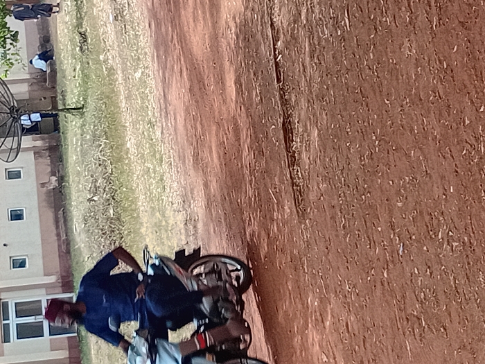 A man wearing a dark blue shirt and maroon cap sits on a motorcycle. The motorcycle is parked on a dirt path that blends into a grassy area. A building with windows is visible on the left. In the distance, people are standing and sitting on the grass. A satellite dish is partially visible near the building.