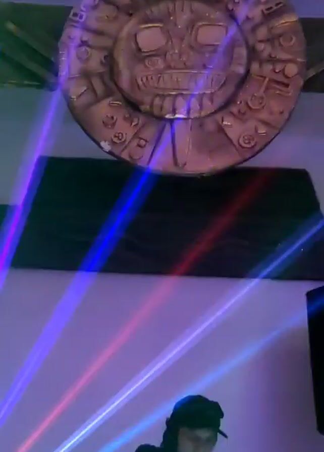 A DJ in a black shirt and hat performs behind a Pioneer mixer, bathed in green, blue, and red laser lights. Above him, an Aztec-style sun decoration hangs on the white wall, which is framed by a dark wooden panel.
