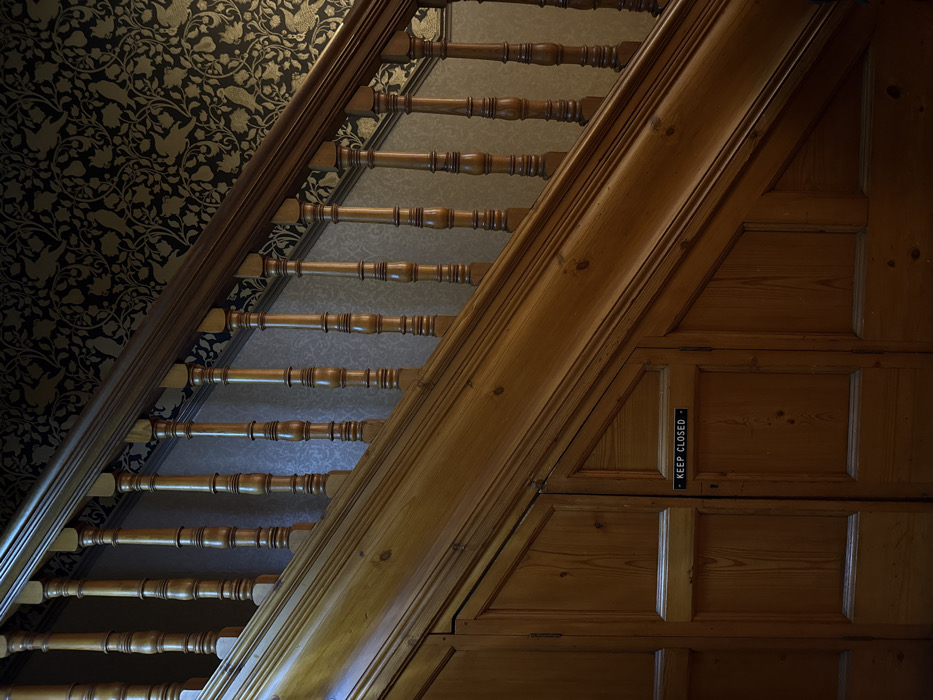 A staircase with wooden banister and railings ascends alongside a wall adorned with patterned wallpaper on the left. To the right, paneled wooden wall with a "KEEP CLOSED" sign attached. The lighting creates shadows that enhance the texture of the wood and the wallpaper's design. The composition is focused on the architectural detail.