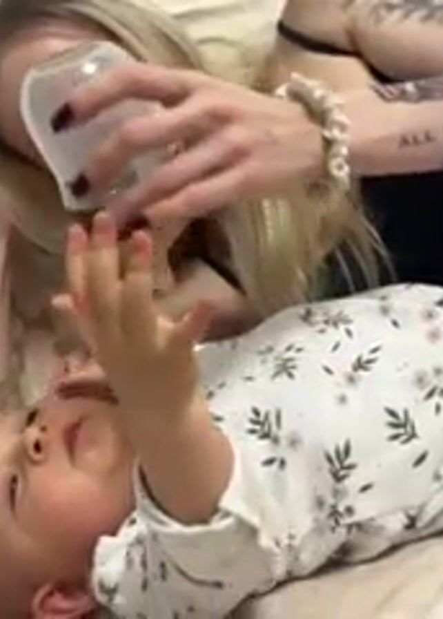 A young, fair-skinned woman with blonde hair is lying on her side in a bed, wearing a black tank top, with tattoos visible on her arms. She is feeding a fair-skinned baby with a bottle. The baby, wearing a white onesie with a floral print and pink pants, is lying on its back and holding the bottle with its hands. The woman attempts to give the baby a pacifier while the bottle is out of its mouth. The bed has a patterned sheet and a pillow with a similar pattern. The wall behind the bed is white.
