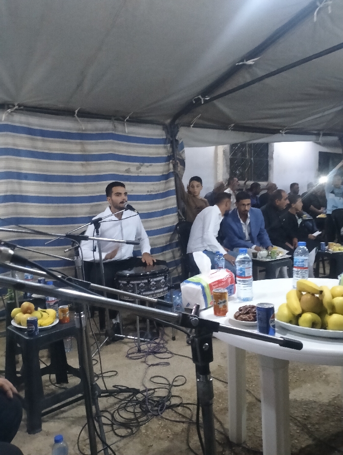 This image depicts an event occurring under a grey canvas tent with blue and white striped fabric sidewalls, situated in Al-Ghanto, Syria. The ground is exposed earth. In the foreground, an adult male with a mustache, wearing a white long-sleeved shirt, is seated, performing or addressing an audience. He is positioned behind a dark, patterned hand drum and speaks into a microphone mounted on a stand. Multiple additional microphone stands and a tangle of black audio cables are visible on the ground in the immediate foreground and around the performer. To the performer's right, a black plastic stool serves as a small table, holding a white plate containing bananas and other yellow fruit, along with two soft drink cans (one blue, one orange). Further to the right and slightly in front, a white round plastic table displays a white plate of various fruits (yellow apples, bananas, green fruit), a small plate of dates, a blue soft drink can, a plastic water bottle, and a box of facial tissues. In the mid-ground and background, an assembly of men is seated at tables, facing towards the performer. They are dressed in various casual to semi-formal attire. Several plastic water bottles are visible on their tables. A young male stands behind the seated audience members on the left side. Behind the audience, a light-colored building with dark, barred windows is visible. The scene is illuminated by artificial light, likely from within the tent structure.