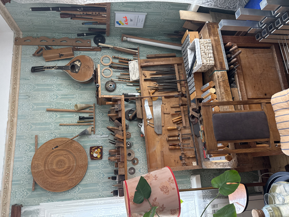 This image depicts a cluttered interior room, identified as a workshop or museum exhibit in Chernihiv, Ukraine, characterized by light blue wallpaper with a recurring damask pattern. The room is filled with woodworking tools, traditional musical instruments, and raw materials. On the left, a window with sheer white curtains provides natural light. Below it, a floor lamp with a patterned pink and red fabric lampshade, partially obscured by a large green Monstera plant leaf, stands next to a small round dark table holding a glass bottle and two empty glasses on a black tray. The walls are extensively utilized for display and storage. A large, circular, intricately carved wooden plaque dominates the upper-left wall. Below it, a small framed artwork depicting musical instruments hangs. Shelves throughout the room hold various wooden and metal tools, including chisels, files, small planes, and parts for musical instruments such as flutes and pipes. A wooden mandolin-like instrument with ornate detailing hangs prominently on the upper-right wall. The central and lower portions of the image are dominated by a sturdy wooden workbench or cabinet unit. The back panel of this unit features an organized display of hand tools, including several saws, a large collection of files, and an array of chisels and carving tools. On the workbench surface, a glockenspiel or metallophone is visible, along with a small woven basket containing mallets. Nearby are hexagonal wooden blocks, possibly instrument components. A wooden chair with a dark upholstered seat cushion is positioned in front of the workbench. To the right, near another window with lace curtains, a framed certificate or award featuring the Ukrainian flag is displayed. On the floor in the lower-right corner, several vertically stacked metallic square tubes are visible, likely materials for construction or instrument making. The overall impression is a dedicated artisan's space for crafting wooden objects and traditional musical instruments.
