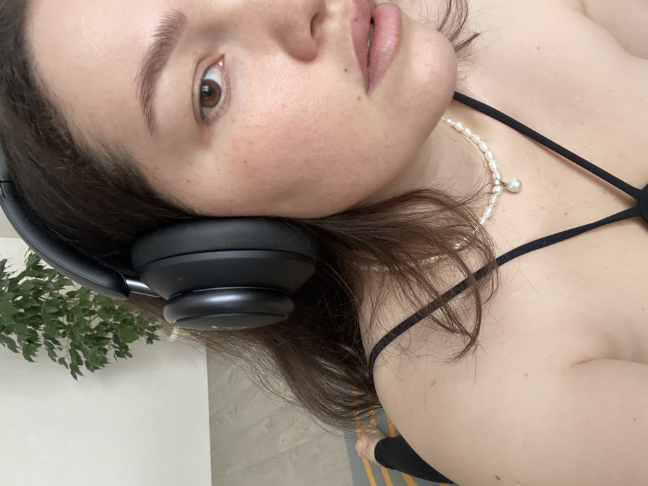 A woman reclines with dark headphones pressed against her head. She wears a pearl necklace and a black strappy top, and black leggings are visible in the lower right corner. Her skin is fair, and her brown hair is loose. A plant is visible in the lower left corner. The floor appears to be tile, and there's a mat with yellow stripes beneath her feet.
