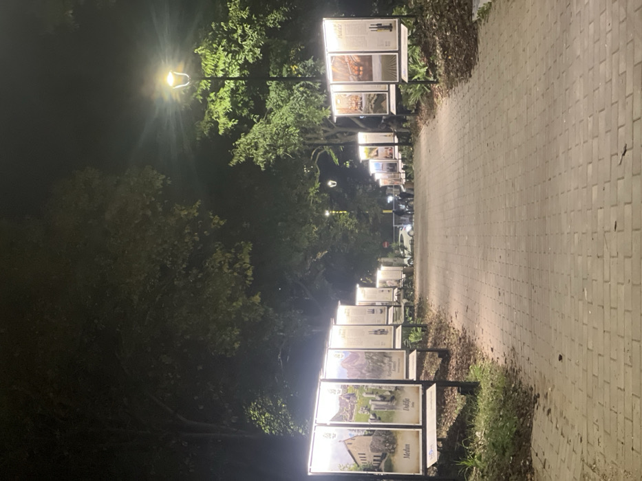 The image displays a paved pedestrian walkway at night, located in Podgorica, Montenegro. The walkway is bordered on both sides by rows of approximately 1.5-2 meter tall, illuminated vertical display panels. These panels feature images and text, with visible captions such as "Medun" and "Duklja." The path, constructed of light-colored pavers, recedes into the distance under the illumination from overhead streetlights and the self-illuminated displays. Dense trees with visible foliage line both sides of the pathway, their canopies appearing dark against the night sky, with some leaves partially illuminated. In the middle distance on the right side of the path, a group of approximately five to seven indistinct individuals is present near a parked white sedan. The ground adjacent to the path consists of sparse vegetation and leaf litter.