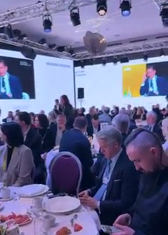 large room set up for a formal breakfast or brunch event, with round tables occupied by attendees in business attire. The event appears to be a "Ukrainian Breakfast," as indicated by the text on the screen behind the audience. On the screen, a man in a suit is visible, presumably speaking or being displayed as part of the event. The room is brightly lit, with stage lighting visible above. Attendees are engaged in various activities, such as eating, looking at their phones, or listening to the presentation. A server is seen moving between the tables. The overall setting suggests a professional gathering or conference with a focus on Ukrainian affairs.