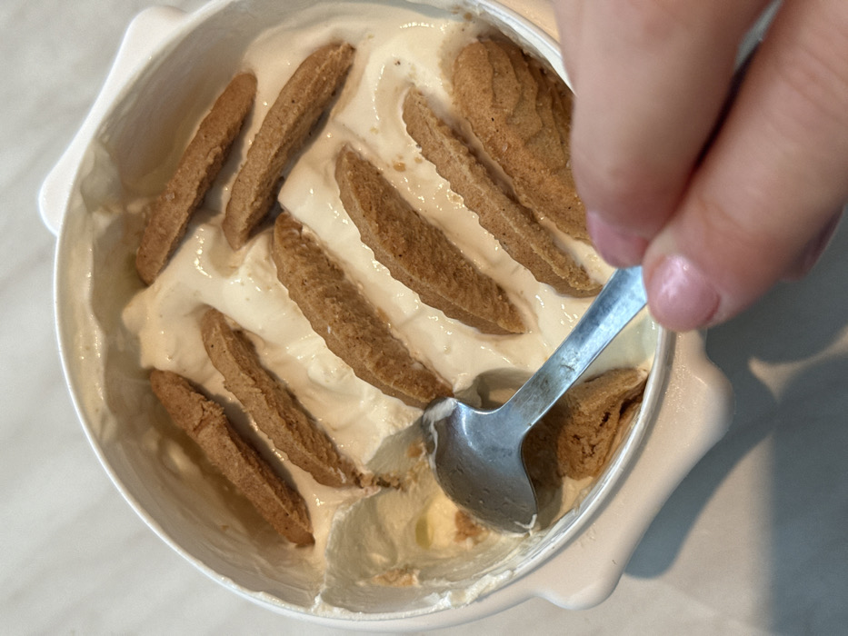 An overhead view within a domestic setting in Kalyvia Thorikou Municipal Unit, Greece, depicts a white rectangular container partially filled with a light-colored, creamy dessert substance, possibly ice cream or yogurt. Approximately ten elongated, ridged, light brown biscuit-like pieces are arranged mostly parallel to each other on the surface of the dessert. A silver-colored metal spoon is positioned in the left side of the container, partially submerged in the dessert, with a portion of the dessert displaced, revealing a lighter, possibly yellow, layer underneath. A human hand, exhibiting manicured fingernails with light pink polish, grasps the handle of the spoon from the lower right quadrant of the image, indicating an active consumption of the dessert. The background consists of a light-colored, possibly white or off-white, horizontal surface.