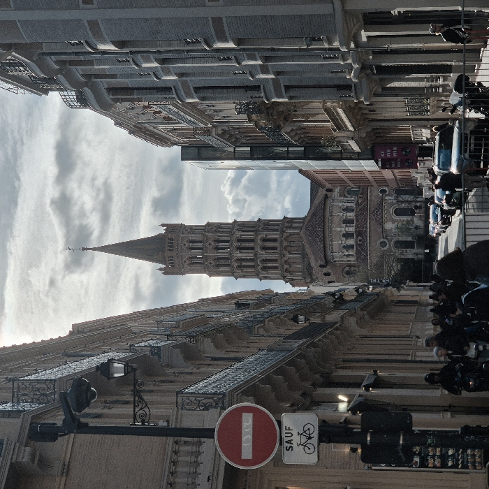 The image depicts a street scene in Toulouse, France, looking down an urban thoroughfare towards the Basilica of Saint-Sernin. The basilica's prominent Romanesque octagonal bell tower, constructed of brick with multiple arched tiers culminating in a conical spire topped with a cross, stands centrally in the background under an overcast sky featuring patches of bright light. The lower sections of the basilica's main structure, including its apses, are visible beneath the tower. On the left, multi-story buildings with light-colored facades and ornate iron balconies line the street. A black lamppost in the foreground features a security camera and a traditional lantern. Attached to the post are two circular street signs: a red circle with a white horizontal bar (indicating "No Entry" or "Do Not Enter") containing faint, indiscernible text, and a rectangular white sign below it displaying a bicycle icon and the French word "SAUF" (meaning "Except"). On the right, multi-story buildings, some with darker facades and balconies, recede into the distance. A modern building with a glass facade is visible further down the right side of the street. A line of parked cars extends along the right side of the road. In the lower foreground, a group of pedestrians is visible on the sidewalk and street, with several individuals appearing to be on scooters or motorcycles. A metal street barrier is partially visible in the bottom right corner.