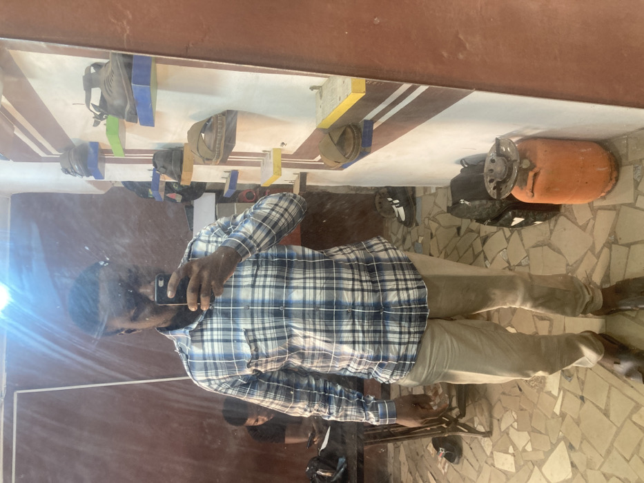 A male individual is depicted in a mirror selfie taken within an indoor space in Yelwa, Nigeria. The subject stands centrally, wearing a blue, white, and black plaid long-sleeved shirt and light brown trousers. He holds a black smartphone in his right hand to capture the image, obscuring his face. The reflection in the mirror reveals a room with reddish-brown walls and a floor composed of a mosaic pattern of light-colored, broken tiles. To the left of the main subject, another male is seated at a table, engaged with a mobile phone. A black bag and the frame of a sewing machine are visible on or near this table. An exposed light source is reflected in the upper left portion of the mirror. To the right of the main subject, a section of white wall features a vertical arrangement of staggered shelves painted in blue, yellow, and green. Various footwear, including sandals and closed-toe shoes, are displayed on these shelves. On the floor in the lower right, an orange gas cylinder with an attached single-burner stove head is present, next to a black bag.