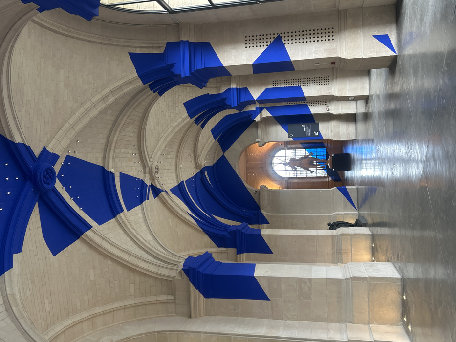The image portrays an interior view of the Grand Hall within the Palais des Beaux-Arts in Lille, France. The long hall is characterized by light beige stone architecture, featuring prominent rectangular pillars supporting a high vaulted ceiling constructed from cut stone blocks. A contemporary art installation overlays sections of the historical structure with vibrant electric blue geometric patterns—comprising triangles, trapezoids, and broad strips—applied to the ceiling vaults, arches, and pillar surfaces, creating a dynamic, fragmented visual effect. The polished dark gray floor reflects the overhead architecture and various light sources. At the far end of the hall, centered beneath a large arched window with visible gridded panes, stands a bronze equestrian statue on a dark, squared pedestal, partially silhouetted by the bright external light. Closer to the viewer, on the left side, a dark, standing human figure statue is partially visible behind a pillar. On the right wall, between pillars, a dark rectangular information sign with white text, including the number "0" and an arrow pointing left, is mounted. Recessed lighting fixtures are visible within both the blue and stone sections of the ceiling. Additionally, vertical rows of small circular perforations are present on some stone wall sections on the right. No human figures are present, rendering the scene static.