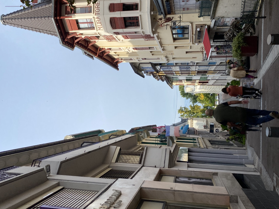 The image depicts a steep, downward-sloping street in Évian-les-Bains, France, flanked by multi-story buildings under a clear, light blue sky. On the left, structures feature pale facades, windows with horizontal blinds, and balconies; a large portrait or mannequin head is visible in a shop window, and French flags are draped from a balcony midway down the street. On the right, a prominent cream-colored building exhibits a distinct tiled turret roof, dark red window shutters, and ornate ironwork balconies. The name "MURATORE" is displayed on this building, above a ground-level storefront with a red awning partially identifying it as a "RESTAURANT." Five individuals are observed walking downhill: a bald man in a dark green shirt and blue jeans leads, followed by a person in an orange jacket pushing a dark stroller, and two elderly individuals. Dark bollards line the street, which features lighter-colored paving strips down its center. In the distance, between the buildings, a body of water (likely Lake Geneva) and green trees are visible, with two white cars parked on a lower road section. Planters with greenery and a wooden sculptural element are situated on the right sidewalk.