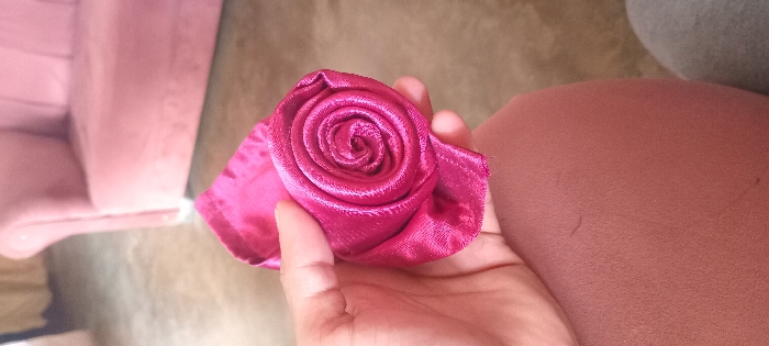 A hand holds a small, vibrant pink satin rose. The rose is tightly coiled, resembling a miniature bloom. The fabric has a sheen, catching the light and highlighting the folds. The background shows a pink object, possibly a sofa or chair, and what appears to be a person's thigh covered in fabric. The scene is illuminated with soft, natural light.