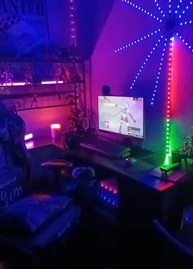 The video displays a gaming setup in a room illuminated by colorful LED lights