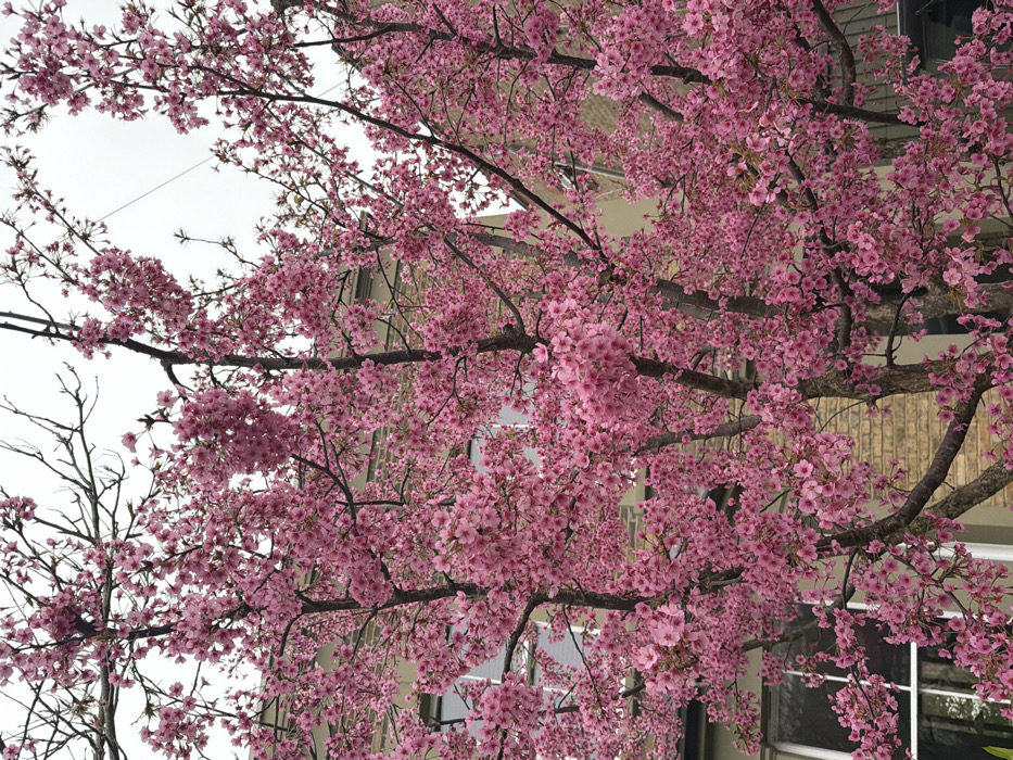 The image presents a close-up view of a cherry tree in full bloom, heavily laden with vibrant pink blossoms that occupy the majority of the frame. Numerous clusters of small, pink flowers are visible on dark brown branches, some of which are bare towards the top. Behind the dense foliage, a multi-story building is partially discernible. Its lower section exhibits tan brickwork, while the upper visible portions feature a muted greenish-beige or light brown facade. Several rectangular windows with white frames are evident on the building, some reflecting the overcast, light grey sky. A thin, dark wire or cable is present diagonally across the upper right quadrant of the sky. No people, discernible actions, or interactions are visible. The architectural style of the building, featuring brickwork and specific window designs, is consistent with structures found in the city of London, United Kingdom.