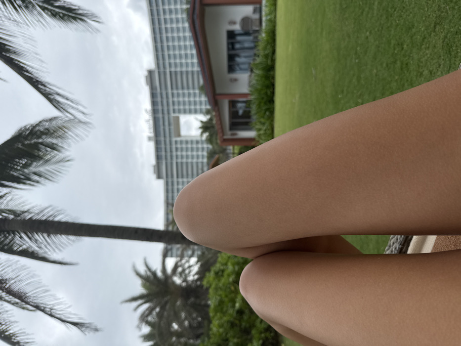 A person's bare legs are crossed at the knees in the foreground, with a backdrop of a tropical scene