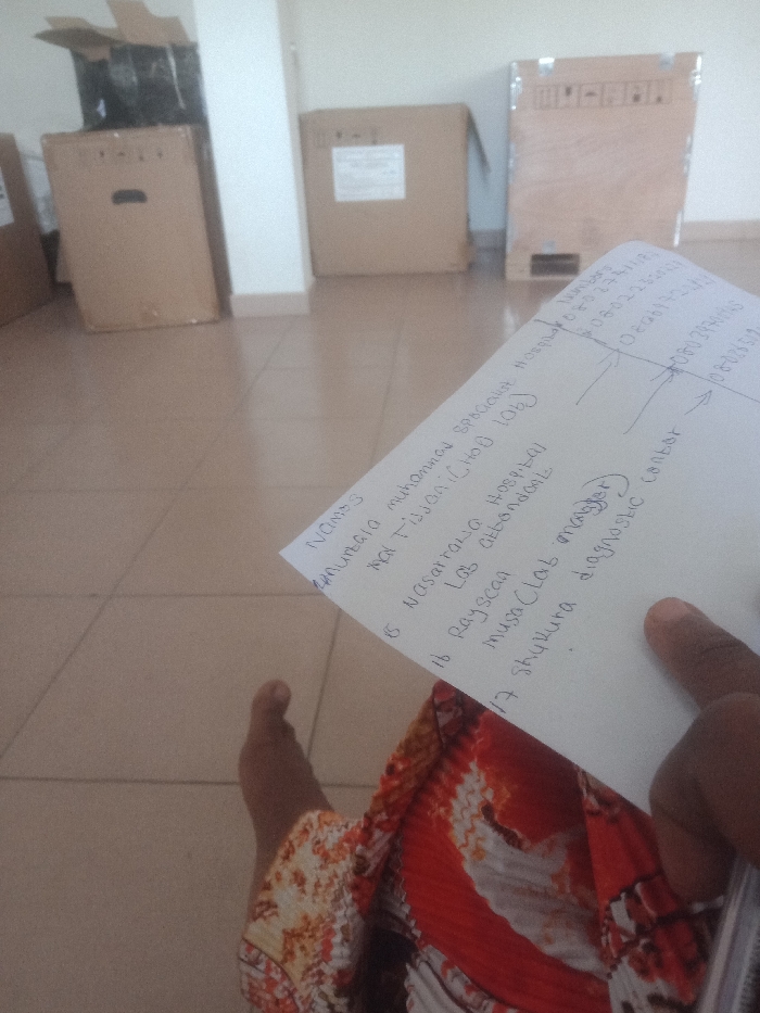 The image depicts an indoor scene from a first-person perspective, focused on a dark-skinned hand holding a white sheet of paper with handwritten blue ink. A clear blue pen is partially visible, held with the paper. The paper contains a list with headings like "NOMSS" and "Numbers," followed by entries such as "Anunata muhammad Special Hospital," "mai Tissani (CHB lab)," "Nasarrawa Hospital," "Rayscan," "musa (lab manager)," and "Shukura diagnostic center," alongside associated phone numbers. Below the paper, a portion of a dark-skinned bare foot and lower leg is visible, resting on a light-colored tiled floor. The person is wearing a patterned garment with red, white, and orange/brown hues. The background shows a room with plain, light-colored walls and the same tiled floor. Several large boxes are present: a tall brown cardboard box with a handle cut-out stands on the left, with other stacked dark objects behind it. Further back and to the right, another brown cardboard box displays a white label. On the far right, a lighter-colored wooden or heavy-duty cardboard crate with visible markings is positioned. The presence of these boxes suggests a storage area, a receiving area for goods, or a room where items have been recently delivered. The image provides no specific visual information to identify the location as Gandu Albasa, Nigeria.