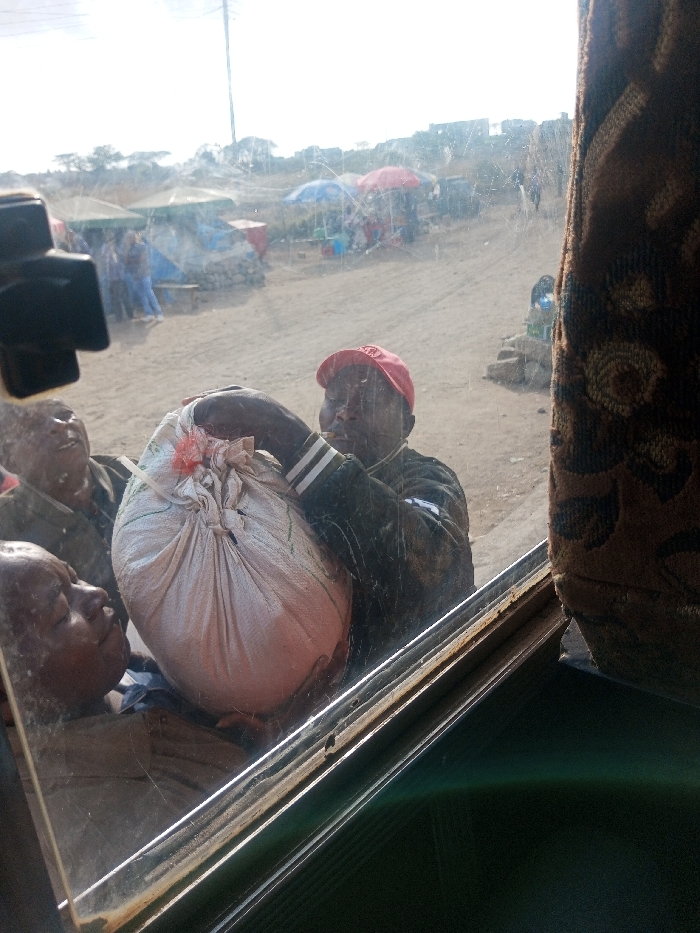 The image, taken from inside a vehicle looking out through a scratched window, depicts an active market scene in Kinanie ward, Kenya