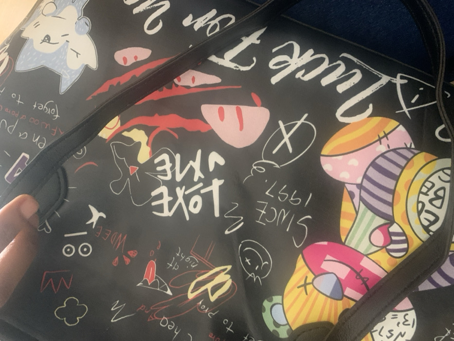 - "This close-up, angled photograph, taken in Ihiagwa, Nigeria, displays a black bag or fabric item extensively adorned with multi-colored, graffiti-style artwork and text" by FM-XklOj2, licensed under CC BY 4.0