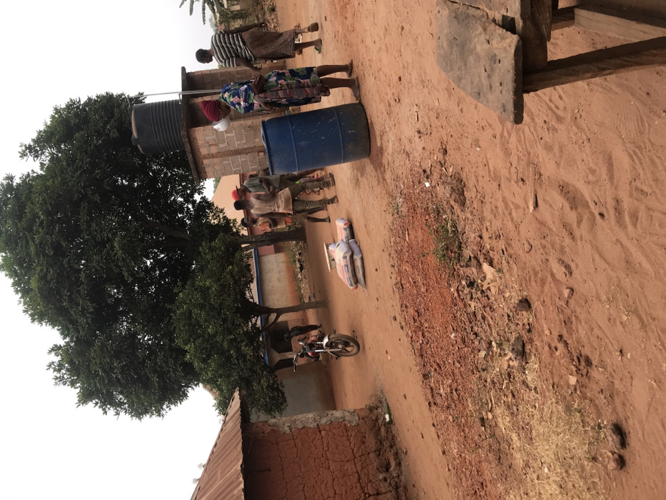 The image depicts an outdoor scene in Ogodo, Nigeria, characterized by reddish-brown dirt ground with scattered rocks and sparse dry vegetation. In the lower right foreground, a portion of a rustic wooden bench is visible. On the left, a single-story building with textured reddish-brown walls and a corrugated metal roof stands. A silver-colored motorcycle is parked on the dirt road to the left of center, near a stack of three to four white sacks, which are topped with a light-colored object resembling a scale or tray. In the mid-ground, a group of approximately four to five men are gathered. One man wears a red baseball cap and a light-colored tank top; their clothing appears soiled. To the right of this group, a blue plastic barrel stands upright. A woman with a red headscarf and a multi-patterned dress stands beside the barrel, balancing a white bowl on her head. Further right and slightly behind her, another woman walks away, wearing a striped top and a brown skirt. The background features an elevated brick structure supporting a black plastic water tank. Several large trees with dense green foliage are prominent, with additional buildings featuring lighter-colored walls partially visible beneath them. The sky is uniformly overcast and light-toned.