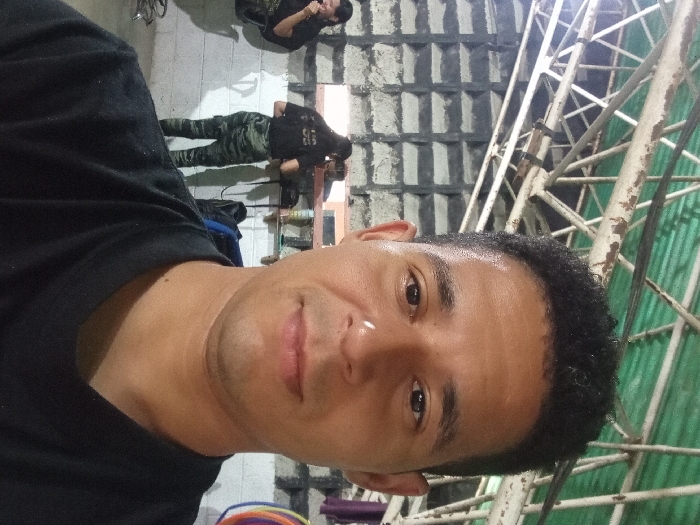 A medium-shot selfie captures a male individual with short, dark, curly hair and light brown skin, wearing a black v-neck t-shirt, looking directly at the camera with a neutral expression. The scene is set indoors in Duaca, Venezuela. In the background, to the left, a person with long dark hair wearing a black top is partially visible, appearing to smile. Adjacent to this individual, a second person with long dark hair tied back, wearing a black t-shirt with a white emblem on the back and camouflage-patterned trousers, is seen from the rear, leaning over a counter or table surface against a light gray, unpainted concrete block wall. Various objects, including bottles and containers, are visible on a wooden shelf above the counter. A dark bag is on the floor near the wall. The ceiling structure consists of white, partially rusted metal trusses supporting a green corrugated roof. Visible electrical wiring runs along these trusses. The environment suggests a functional indoor space, possibly a community hall or workshop, illuminated by artificial lighting.