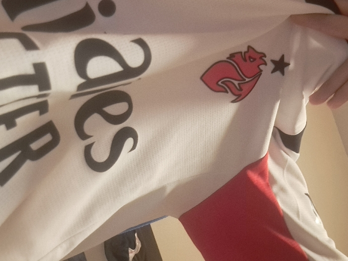 A white, short-sleeved garment, likely a sports jersey, is held vertically by a light-skinned human hand visible at the top of the frame. On the garment's upper left chest/shoulder area, a stylized red dragon logo with a black outline is positioned beneath a solid black five-pointed star. The right sleeve features a prominent red panel, with a smaller black section partially visible above it. The front of the garment displays large, dark gray or black printed text, partially legible as "iaes" and "TTER." The fabric exhibits a fine mesh or perforated texture. The background is out of focus, showing a light-colored wall or surface, with indistinct dark shapes suggesting draped fabrics or objects in an indoor setting to the right. The image contains no discernible features to indicate the specific geographical location, including the city of Montana, Bulgaria.