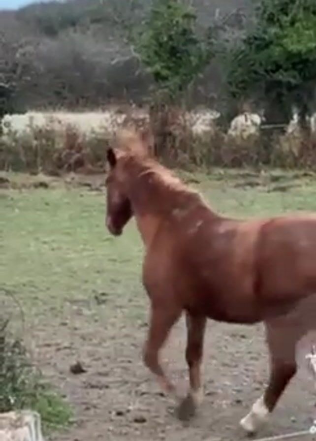 A brown horse walks in a grassy field toward a patch of dirt and foliage before turning around and moving away from the camera. The background includes a hill with trees and bushes, and a fence is visible in the foreground. The sky is overcast.