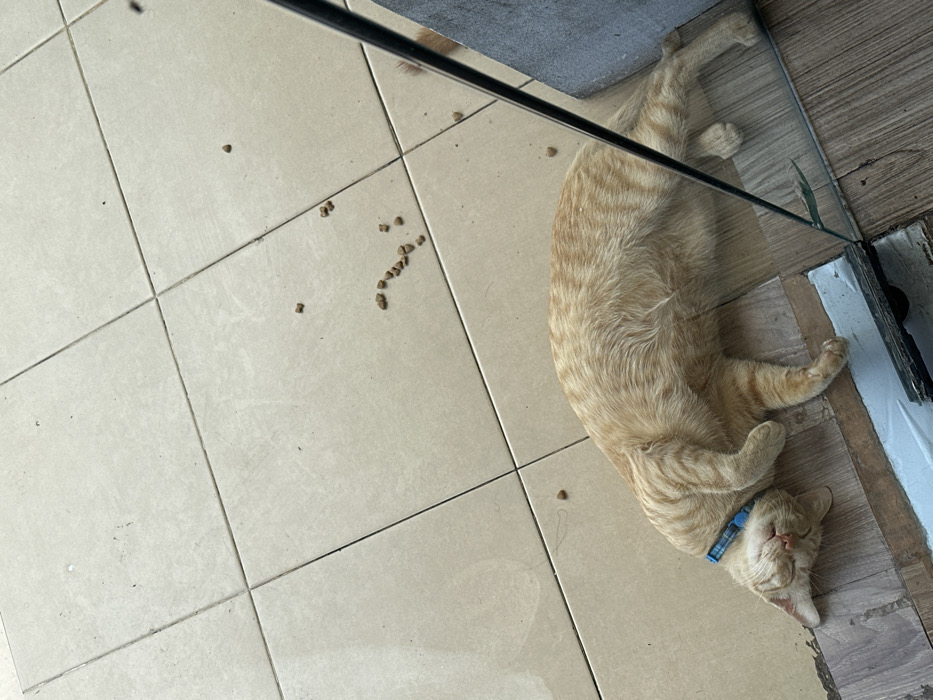 An orange tabby cat is depicted sleeping on its left side on a floor surface in Jimbaran, Indonesia