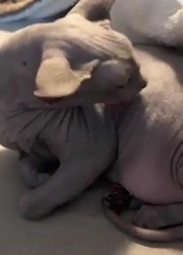- "A Sphynx cat is grooming its left side on a neutral-colored couch" by FM-4WEif2, licensed under CC BY 4.0