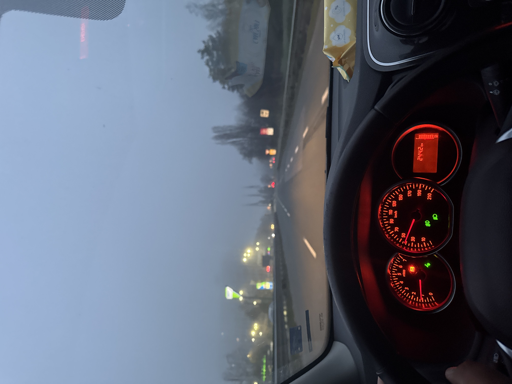 The image, taken from inside a car, shows a view of a foggy street in Burgas, Bulgaria. The car's dashboard is visible, with the speedometer showing a reading and various indicator lights illuminated. The odometer reads 24,422 km. Outside the car, streetlights and other vehicles are visible through the fog, and a large advertisement banner with the text "CVWE 2011" is seen. The overall environment suggests a rainy or misty day in an urban setting.
