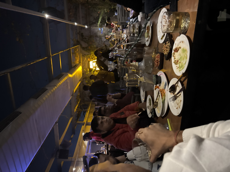 A group of people dine outdoors at night. A long wooden table is covered in empty plates, silverware, and glasses. Some people are eating, while others are talking or looking around. Hookahs are interspersed among the plates, suggesting a relaxed atmosphere. The lighting is dim, with string lights illuminating the scene. A blue roof structure with air conditioning vents is visible above. The angle of the photo is rotated sideways.