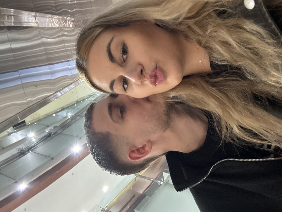 A close-up image depicts two individuals, an adult male and an adult female, in an indoor commercial setting. The female, positioned in the foreground and slightly to the right, has long blonde hair, light skin, and is looking directly at the camera with her lips pursed in a 'kiss' gesture. She is wearing dark attire, with a faint sparkle visible on her lower neck. The male is positioned behind and to the left of the female, largely obscured from the chest down. He has short, dark hair with a fade haircut and light skin. He is engaged in kissing the female's left cheek. He wears a dark, zippered jacket over a dark shirt. The background features modern architectural elements, including transparent glass barriers indicative of multiple levels, and a distinctive reflective ceiling composed of long, undulating metallic panels with integrated lighting, some appearing as bright specular reflections. Based on the contemporary retail architecture, specifically the ceiling design and glass railings, the location is identified as **Paradise Center in Sofia, Bulgaria**.