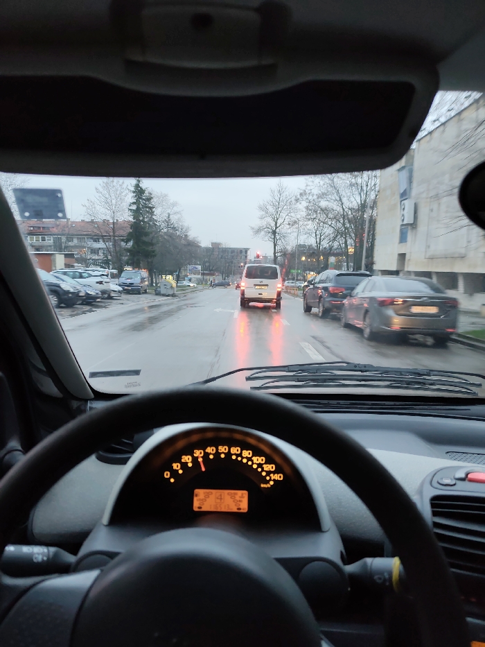 - "The image presents a first-person view from the driver's seat of a vehicle, likely a Smart car, stopped or moving slowly on a wet asphalt road in Shumen, Bulgaria" by FM-PWZXU2, licensed under CC BY 4.0
