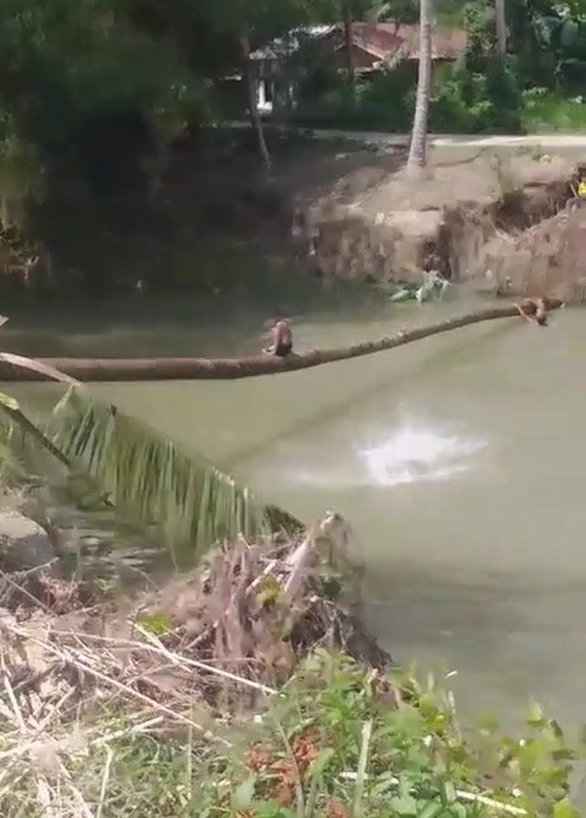 group of people swimming in a small river or stream. A tree trunk spans the water, creating a makeshift bridge. A person is sitting on the trunk, while another jumps into the water. The surrounding environment consists of trees, vegetation, and eroded riverbanks. In the background, a building is visible.