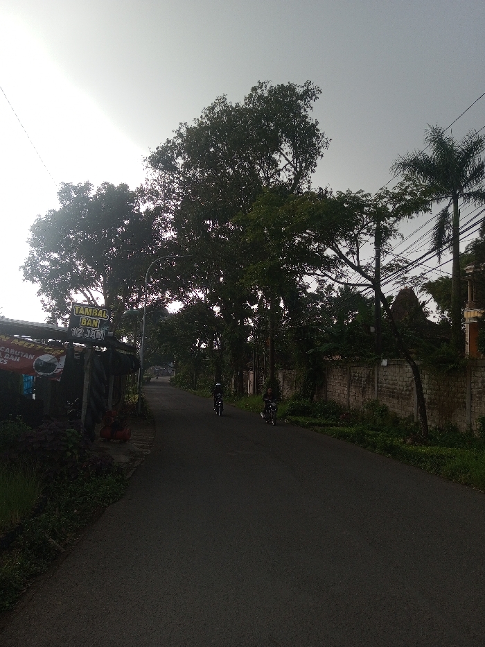 A quiet, paved road stretches into the distance, flanked by lush green trees and foliage. A weathered stone wall runs along one side. Two motorcyclists are seen on the road, heading in the same direction. A small business with signage stands on the left, contrasting with the natural landscape. The sky is overcast, casting a soft, diffused light over the scene. Utility poles and wires are visible against the sky.