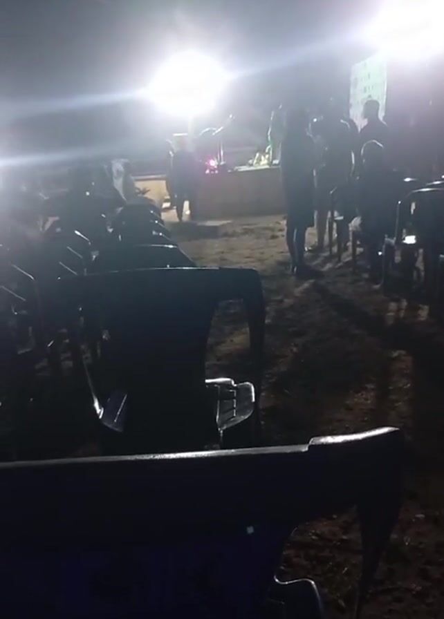 nighttime outdoor event. In the foreground are several rows of unoccupied plastic chairs, set on a dirt ground. In the background, a stage illuminated by bright spotlights features musicians playing instruments. Silhouetted figures are standing and milling about between the chairs and the stage, some appear to be engaging with each other.