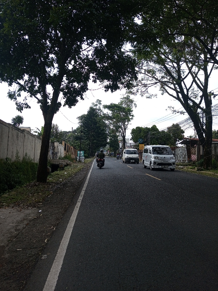 The image depicts an asphalt road in Sandamal Eliya, Sri Lanka, looking forward in the direction of traffic. A solid white line marks the left edge of the road. On the left, a concrete wall runs parallel to the road, separated by a narrow dirt strip and a drainage ditch. Further down the left, green signage and additional structures are visible. Overhead, dense green tree canopies frame the road on both sides, partially obscuring an overcast sky. Three vehicles are observed moving away from the viewer. In the foreground-midground, a person wearing a dark helmet and jacket rides a dark motorcycle. Ahead of the motorcycle and to its right, a silver-white passenger van with a visible front license plate travels. Further down the road, a second, older model white passenger van is present. On the right side of the road, more trees, utility poles, and an array of overhead wires are visible, with glimpses of buildings beyond. The scene indicates an active urban or suburban street.