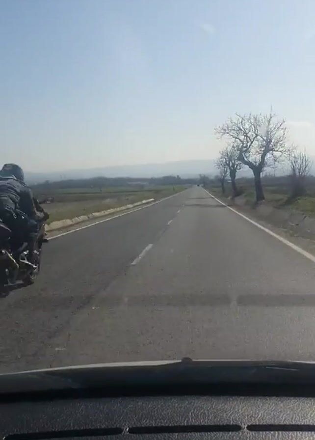 The view from inside a car shows a long, straight, two-lane road in the countryside. The sky is clear and blue. The fields on either side of the road are mostly brown with some patches of green. Several bare trees line the right side of the road. A motorcycle is driving ahead of the car in the same lane. In the distance, a line of mountains can be seen on the horizon. The car's dashboard is visible at the bottom of the frame.