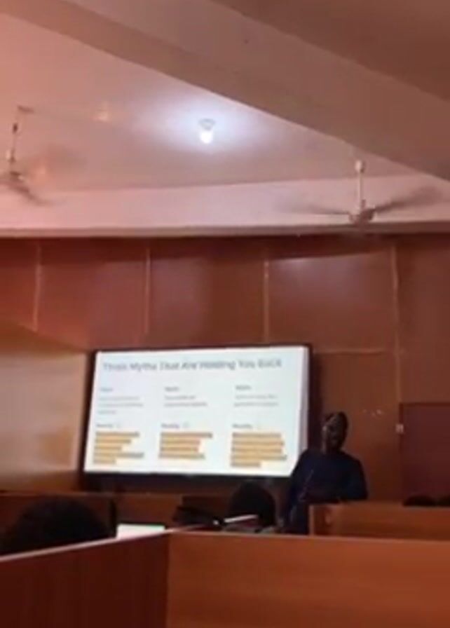 man presenting in a classroom or lecture hall. The man is Black, has a beard, is wearing a blue shirt, and is standing next to a screen. The screen displays the title "Three Myths That Are Holding You Back." Below the title, the screen is divided into three sections. The leftmost section has the myth "You must have a Connector/Influencer to succeed" and its reality. The middle section has the myth "You need an expensive startup" and its reality. The rightmost section has the myth "Startup is only for people in Lagos" and its reality. The classroom has wooden desks and a beige ceiling with ceiling fans. There are a few people visible in the foreground, sitting at the desks. The presenter is gesturing with his hands while talking.