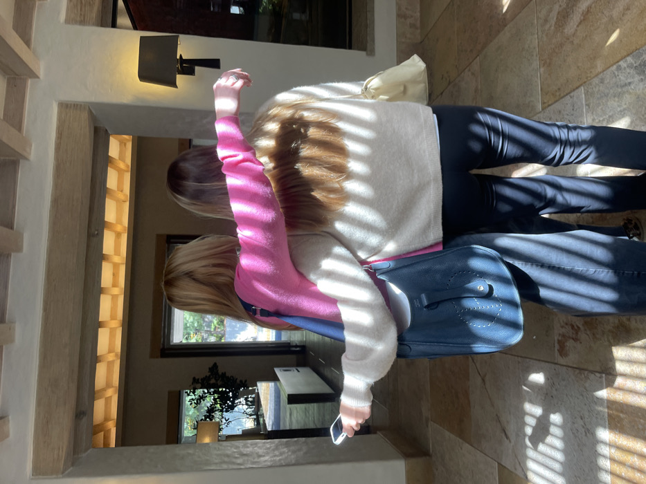 Two women stand closely together in a well-lit indoor space. The woman in the front wears a bright pink sweater and jeans, carrying a blue handbag. The woman behind her has long brown hair and is wearing a white sweater with dark pants. Sunlight streams through windows, creating patterns on the tiled floor and the women's clothing. One woman holds a cell phone. The architecture includes exposed beams and a dark wall sconce.