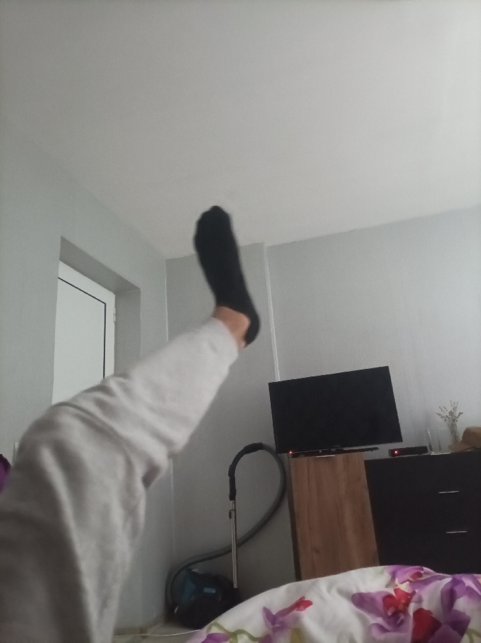 The image displays an indoor residential scene within a room located in Cherven Bryag, Bulgaria. The central subject is a human leg, extended upwards from the lower left towards the upper center of the frame. The leg is clad in light grey fabric, consistent with a sweatpant or pajama bottom, ending just above the ankle. The foot is visible, encased in a black sock. The background reveals a room with light grey walls and a white ceiling. On the left side, a white doorframe is partially visible. Towards the right, a black flat-screen television is positioned on a light brown wooden cabinet. To the immediate right of the cabinet is a dark-colored dresser with multiple drawers. A clear glass vase containing dried botanical elements and a light brown, possibly woven, object rest on the cabinet surface. On the floor, between the doorframe and the furniture, a blue and black canister vacuum cleaner, complete with its telescopic metal wand and grey hose, is stored upright. The lower right foreground shows a section of a white duvet or comforter adorned with a pattern of purple and pink flowers, suggesting the perspective is from a bed. The room appears to be uniformly lit.