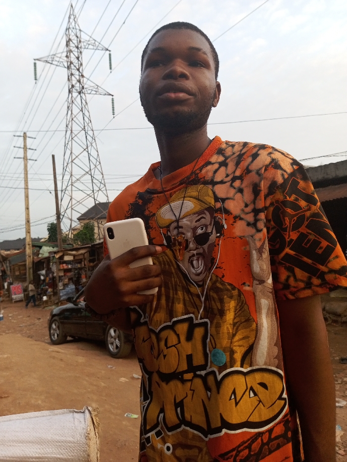 A young adult male stands on a reddish-brown dirt road in Onitsha, Nigeria, looking directly at the camera. He wears an orange t-shirt featuring a prominent graphic of a figure in a cap and sunglasses, with "Cash King" text below, and holds a light-colored smartphone vertically in his left hand. An amber-colored pendant hangs from a black cord around his neck. In the background, a tall, metallic lattice electricity transmission tower is visible to the left, with a wooden utility pole positioned closer to the road. A black sedan is parked on the dirt road further back. Beyond the vehicle, a series of rudimentary market stalls constructed with corrugated metal roofs and walls line the street, where several indistinct figures are observable, indicating activity. The sky overhead is uniformly overcast. A white, textured object is partially visible in the lower-left foreground.