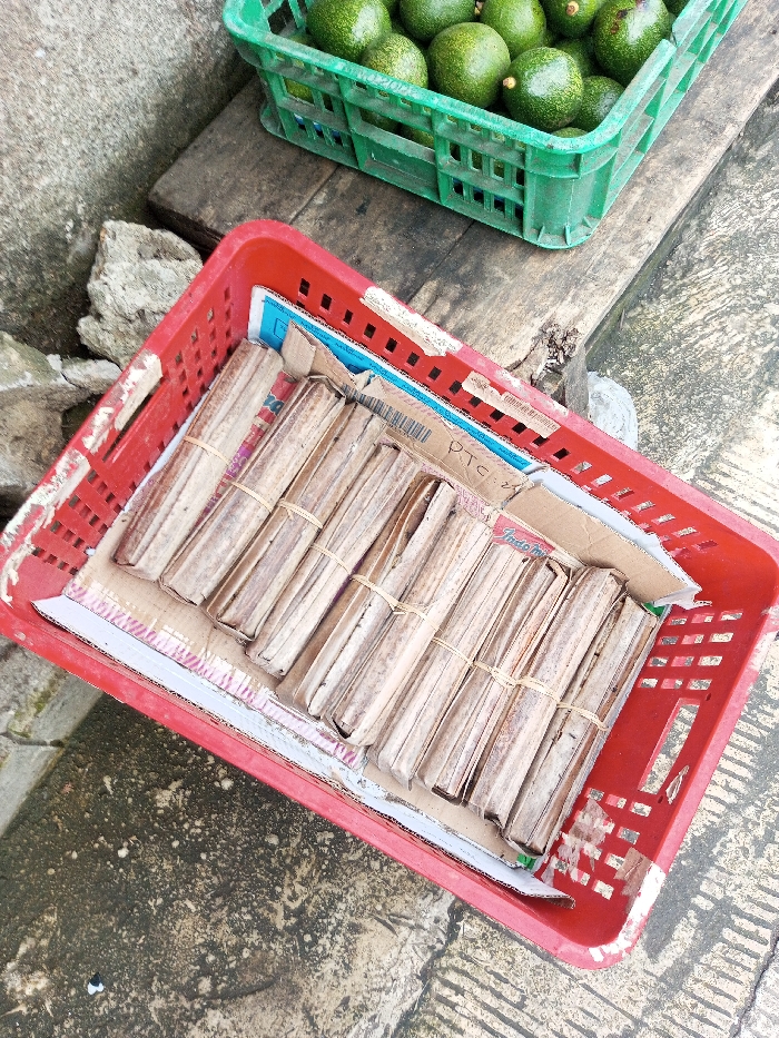 A red plastic crate contains packages of what appears to be dried leaves wrapped and secured with elastic bands, resting on cardboard