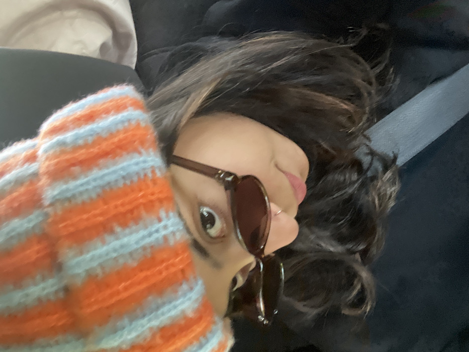 An individual is depicted seated within what appears to be the interior of a vehicle. The subject, presenting as female, is largely obscured by a close-up, high-angle shot. She is wearing a prominent orange and light blue striped knitted beanie. Dark brown sunglasses rest on her nose, partially obscuring her eyes, though her left eye (viewer's left) is visible above the frames, directed upwards and to the left. A small silver ring is present in her right nostril. Her lips are partially visible, showing a light pink coloration. She is wearing dark-colored attire, possibly a jacket or top, and a grey seatbelt is visible diagonally across her chest and shoulder. The background is indistinct, showing muted tones consistent with a vehicle's interior, including a dark element to the upper right, possibly a headrest or seat back. There are no visual cues within the image to confirm the location as the city of Elyashiv, Israel.