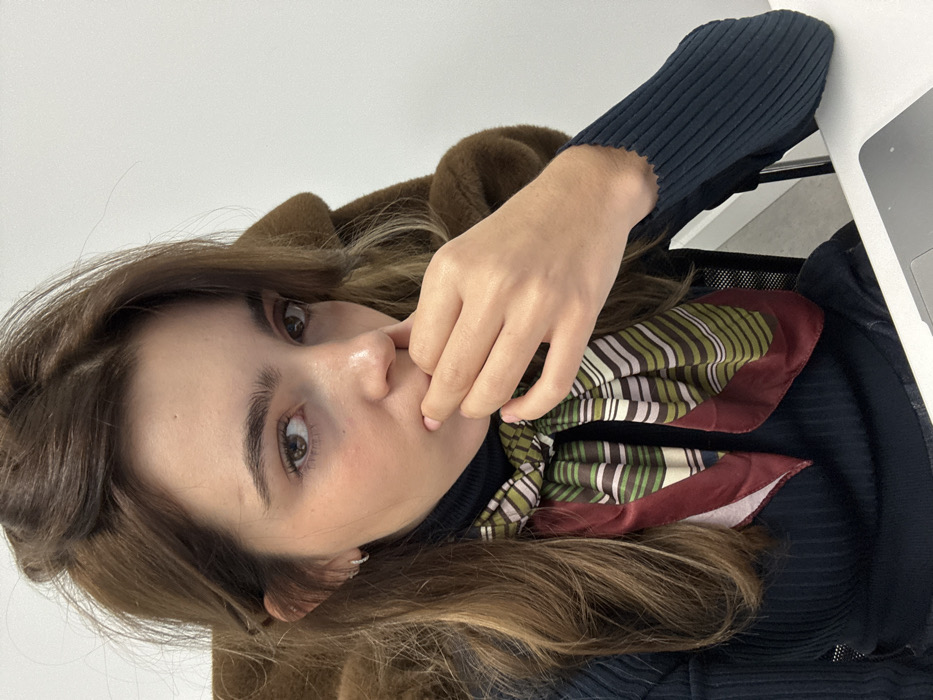 A young adult female is depicted in a close-up, chest-up shot within an indoor environment located in Torres Vedras, Portugal. She possesses long, wavy brown hair and brown eyes, looking directly at the camera. Her right hand is positioned with fingers resting near her lower lip and chin. She is wearing a dark blue or black ribbed turtleneck sweater. Around her neck is a silk-like scarf with a striped pattern featuring shades of green, cream, and brown, bordered by a solid maroon color. A small silver-colored hoop earring is visible in her left ear. She is seated in what appears to be a brown, possibly faux-fur, office chair. A portion of a silver laptop is visible on a white desk in the lower right foreground. The background consists of a plain white wall.
